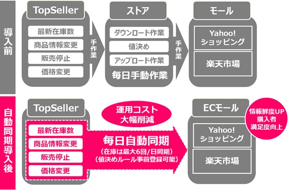 TopSellerを利用するストアは、これまで毎日1時間掛かっていた運営コストを削減することができると共に、最新の情報を表示することで、購入者の満足度向上を図ることができます。7月7日にYahoo!ショッピング版をリリース後、8月中旬~に楽天市場版をリリース予定です。